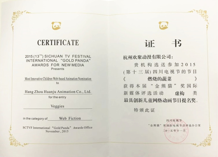 2015年11月26日動(dòng)畫(huà)片《燃燒的蔬菜》榮獲2015四川電視節(jié)“金熊貓”獎(jiǎng)最具創(chuàng)新兒童網(wǎng)絡(luò)動(dòng)畫(huà)節(jié)目提名獎(jiǎng)。本該新鮮到達(dá)的獲獎(jiǎng)證書(shū)慘遭“雙11”的物流狂潮,拖延了半個(gè)月之久,今天終于到啦!這是屬于“蔬菜人”的小驚喜,也是對(duì)蔬菜動(dòng)畫(huà)片的充分肯定和鼓勵(lì)!有權(quán)威的金熊貓獎(jiǎng)作背書(shū),父母?jìng)兏芊判牡刈尯⒆觽冇^看蔬菜動(dòng)畫(huà)片了。