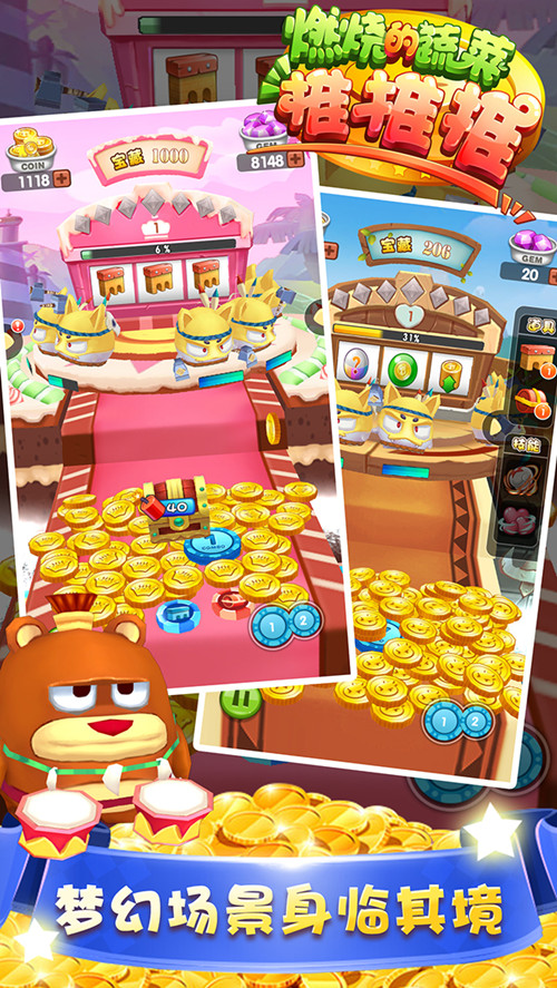 入侵了蔬菜家族的動物部落來到《燃燒的蔬菜推推推》變身激萌部落豬怪獸,正排著隊等待被聯(lián)盟狗擊落。掉落到口袋中的金幣就是擊打怪獸的武器。被金幣砸,怪獸也是幸福的吧。射擊出去的金幣會掉入推臺等待再次被推落。擊落不同的怪獸會得到不同的獎勵,如開啟拉霸、得到寶箱、啟動地震等等。開啟寶箱的鑰匙與金幣一起藏在推臺中,得到鑰匙打開寶箱后有機會得到不同的套裝,集齊一定數(shù)量的套裝并進行合成即可增加免費金幣上限。伴隨游戲等級的上升不斷解鎖新的動物怪獸,同時收集無窮無盡的金幣,開啟新的副本地圖,讓我們一起“刷副本”。