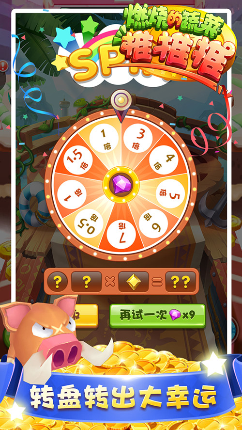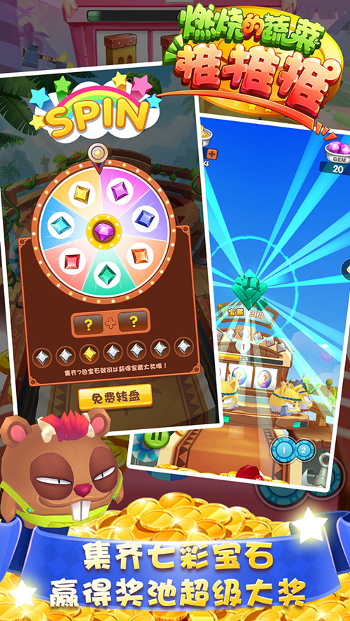 拉霸游藝機的玩法十分經典,在《燃燒的蔬菜推推推》中無縫結合了拉霸的精髓,擊落了指定動物怪獸后直接開啟拉霸,如果拉霸上的三個圖標一致,恭喜你得到幸運之神的眷顧,你可能會得到扭蛋、金幣加厚、鉆石幣、大面額金幣、寶石轉盤等獎勵。打開扭蛋會有不同的驚喜,可能是獎勵轉盤,免費開啟一次獎勵轉盤可隨機轉得金幣,花費少量鉆石有機會得到翻倍的獎勵。扭蛋當中也可能得到稀有收藏品,集齊一整套稀有收藏品即可合成超能力大招!寶石轉盤神秘而耀眼,集齊七顆彩色絕世寶石就能打開寶藏池中的超級大獎。如果拉霸的三個圖標不一致,沒關系,努力開啟下一次拉霸吧!愿圣光與你同在。