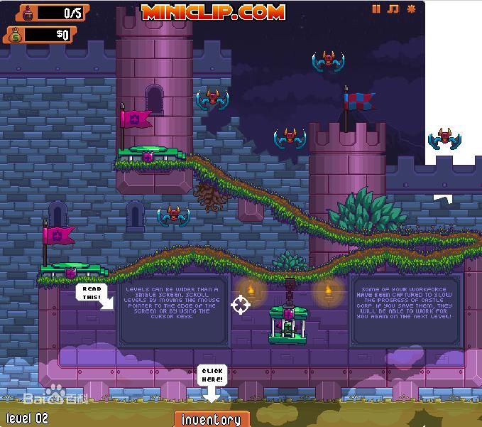 操作方法:首先鼠標點擊選擇下方的inventory欄里面的勇士。勇士上面的是道具欄可以點擊放到勇士身上使用。裝備完勇士之后把勇士放到綠色的平臺上面,鼠標控制飛行必殺的方向,點擊即釋放飛行必殺。消滅右上角要求的敵人數(shù)量即可完成任務(wù)。