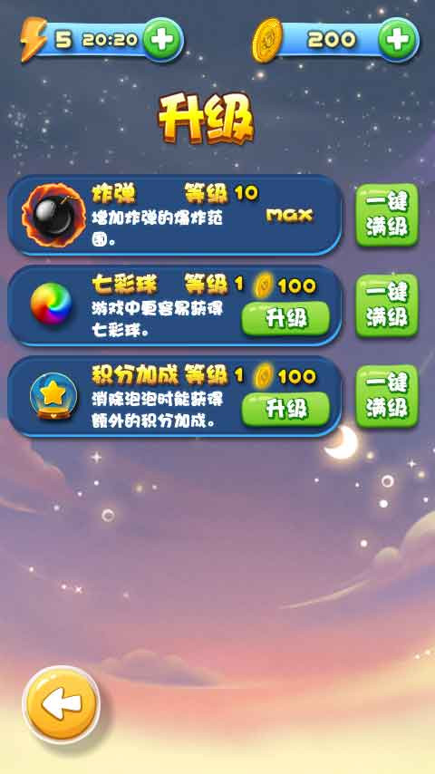 炸彈可增加炸彈的爆炸范圍,七彩球可增加游戲中出現(xiàn)的概率,積分加成可增加游戲中獲得的積分。(皆為原基礎(chǔ)的0.2倍)