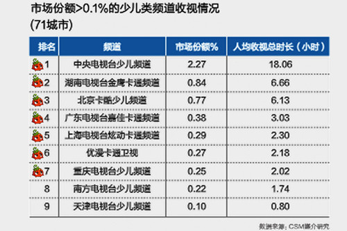 據(jù)CSM媒介研究院數(shù)據(jù)顯示,目前國內(nèi)71個(gè)城市中,少兒類頻道共有31個(gè),含6個(gè)上星頻道,17個(gè)省級(jí)非上星頻道和8個(gè)市級(jí)頻道。